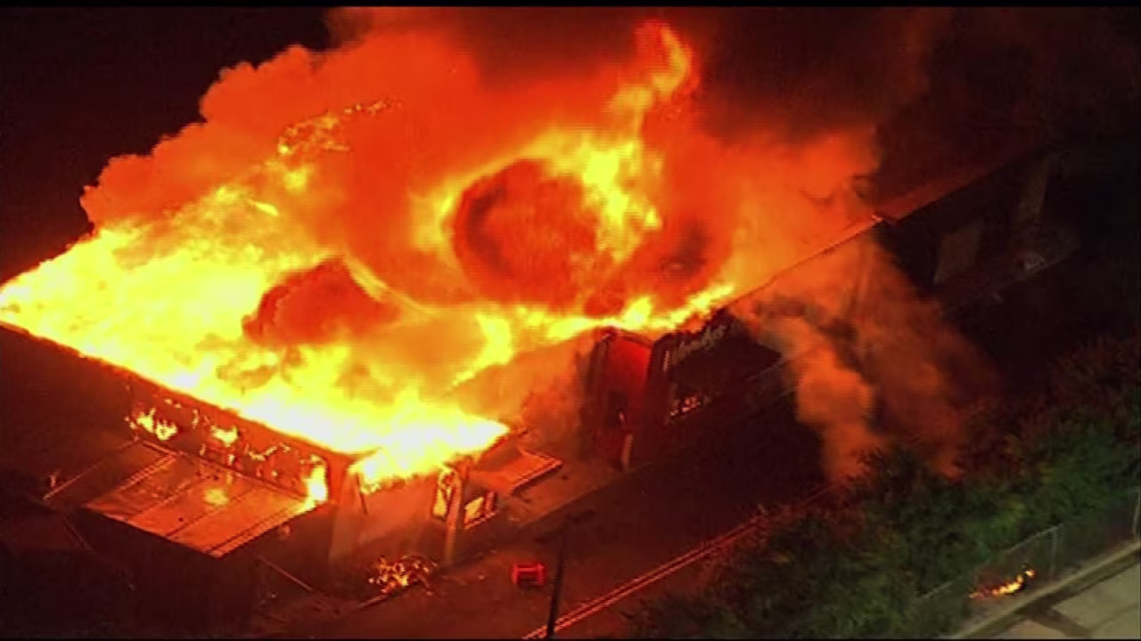 Flames and black smoke can be seen coming from the windows of the restaurant. in Atlanta.