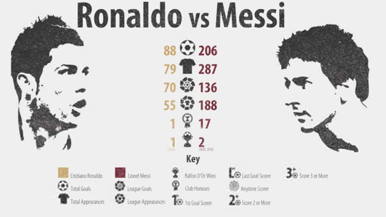 The pair's scoring exploits compared, with Messi in red and Ronaldo represented by the gold band.