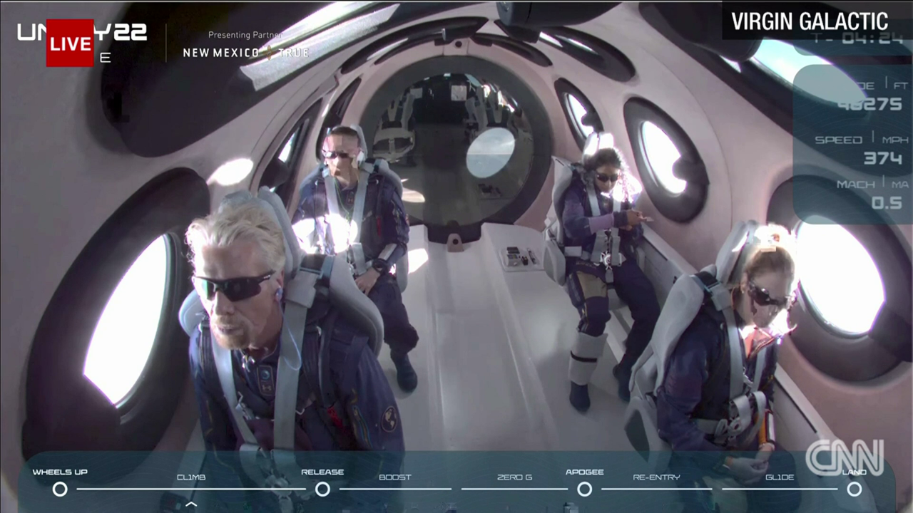 The four crew members of SpaceShipTwo VSS Unity, including the billionaire backer of Virgin Galactic Richard Branson, is strapped in and about to take off.