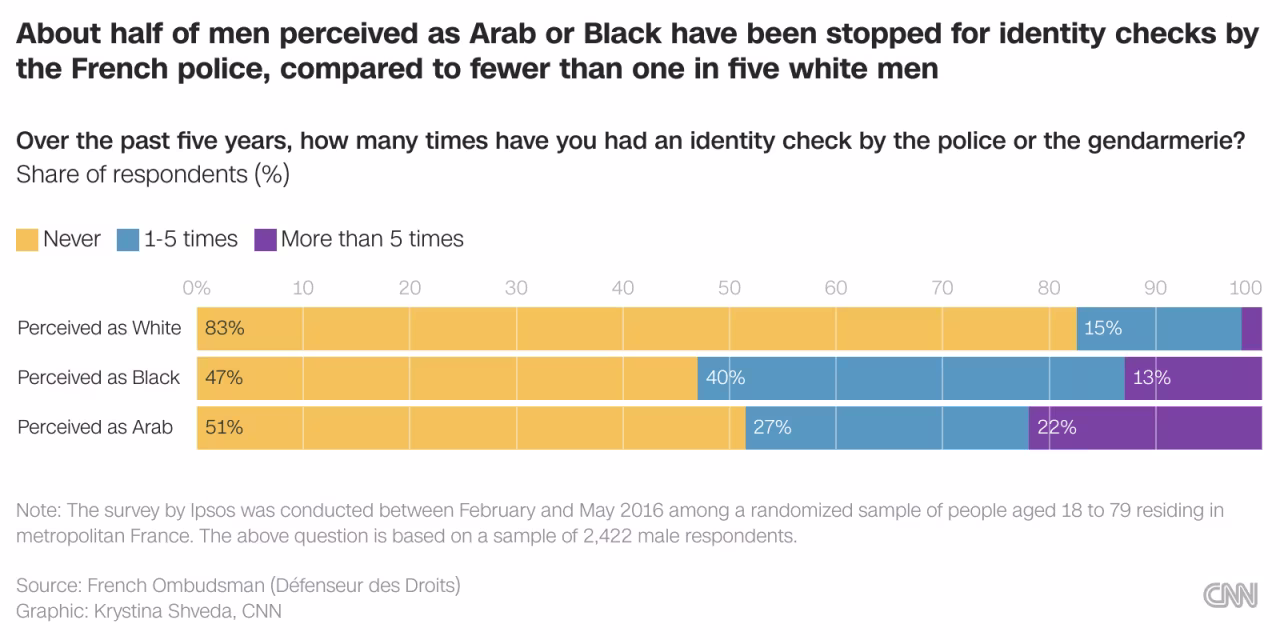 A 2016 survey by the French Ombudsman found that 53% of men perceived as Black and 49% of men perceived as Arab had been stopped by the French police at least once, against only 17.5% of White men.