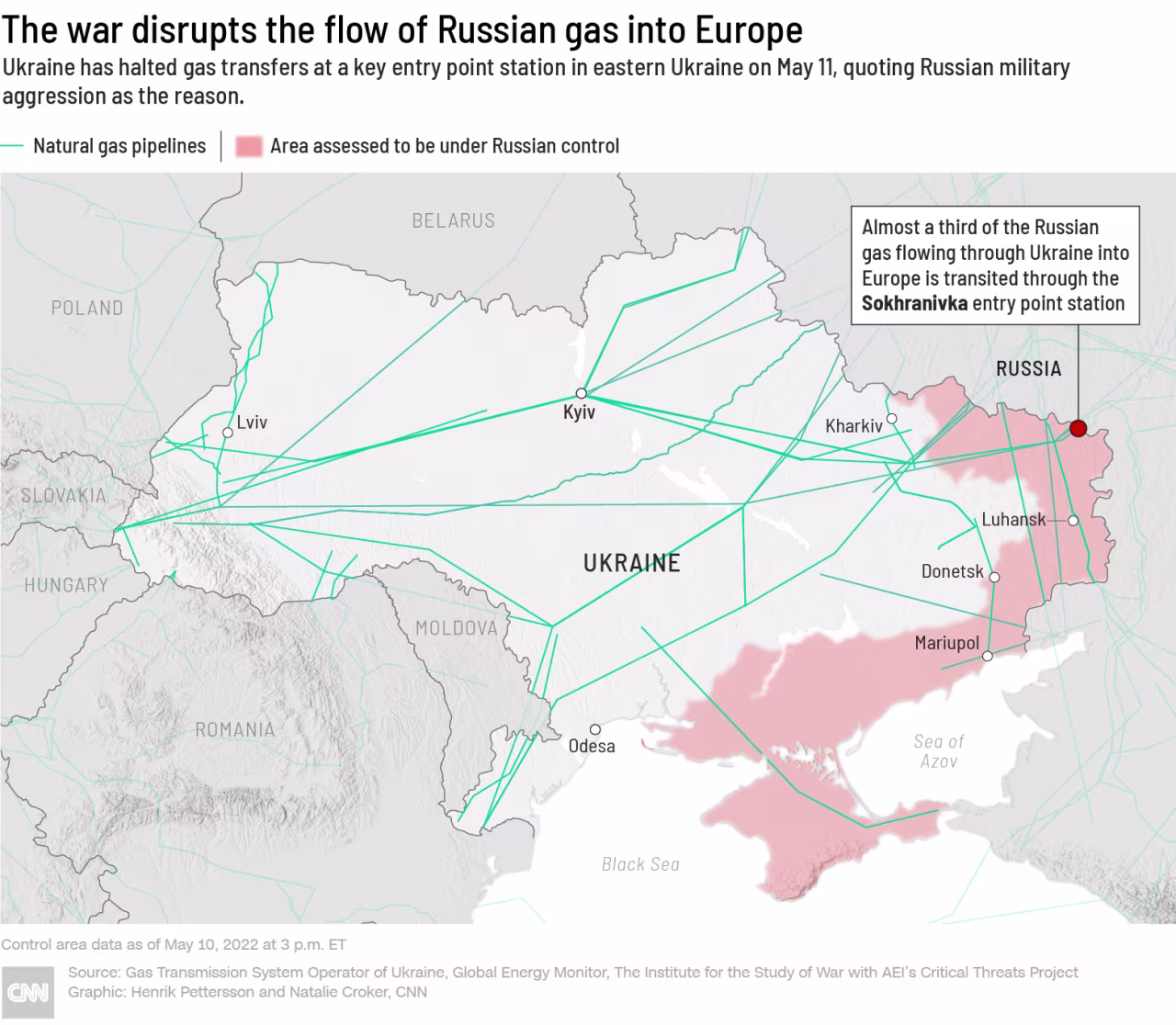 Not only is the European Union debating an embargo on Russian oil, but Ukraine suspended the flow of some Russian natural gas to Europe. The Ukrainian gas transmission system operator blamed “interference by the occupying forces.”