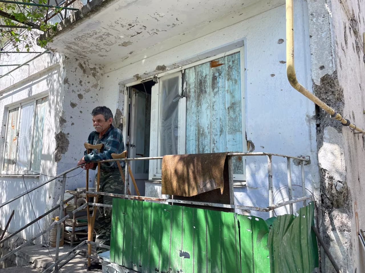Driving into another village nearby, the damage looks the same. In Kotlyareve, few people walk the streets, several elderly are seen on bikes.