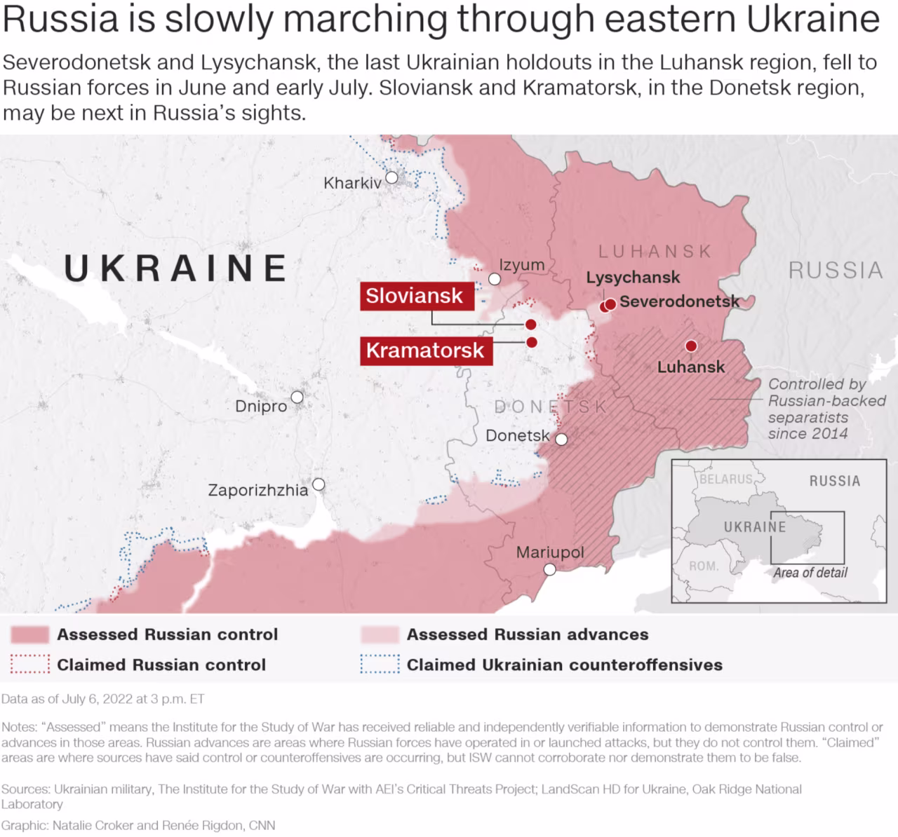Russian President Vladimir Putin’s declared objective is to take all of the regions of Donetsk and Luhansk, but Ukrainian forces still control more than one-third of Donetsk.