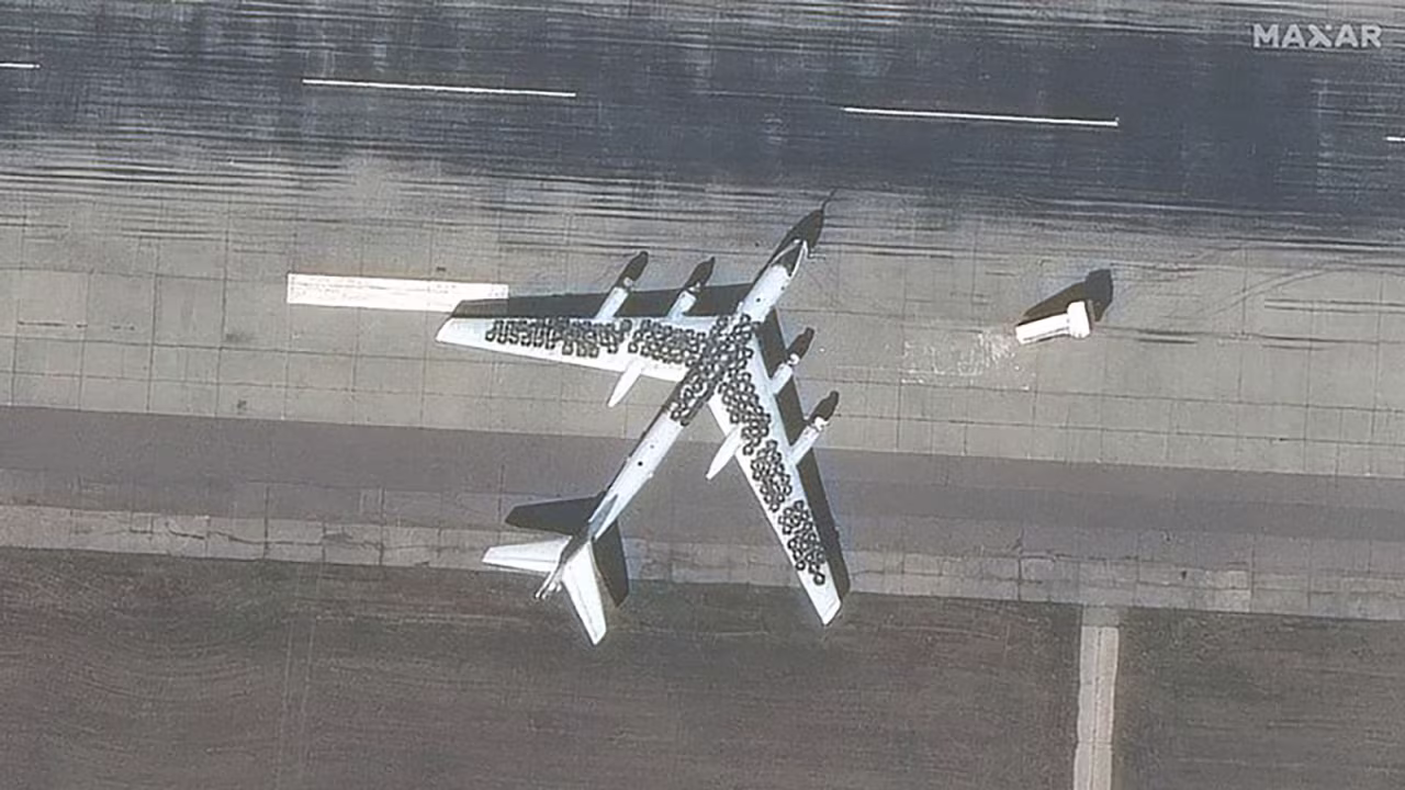 Satellite imagery from Maxar of Engels Airbase, deep inside Russia, shows two Tu-95 strategic bombers with car tires on top of the airframes.