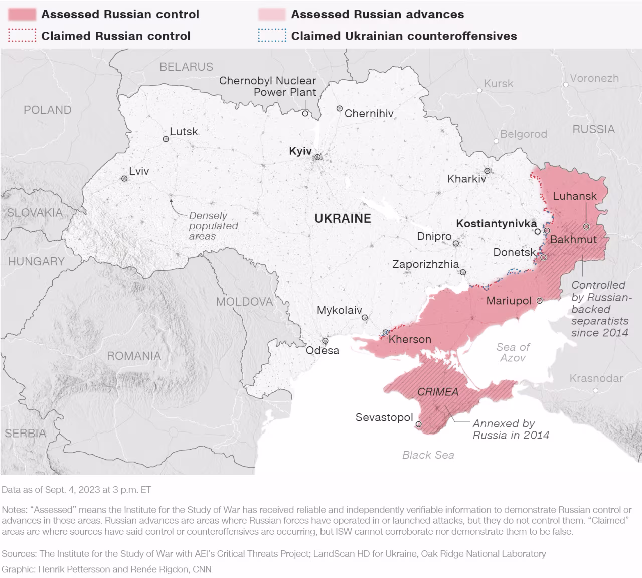 Ukraine claims further marginal gains in the south: Accounts from the front lines in southern Ukraine suggest further incremental gains for Ukrainian forces amid constant artillery, mortar and rocket fire from both sides. Geolocated videos show a wasteland of shell holes, abandoned trenches and wrecked military hardware in the area between Robotyne, Verbove and Novoprokopivka — a triangle of villages that hold the key for Ukrainians to getting closer to Tokmak, an important hub for Russian defenses.