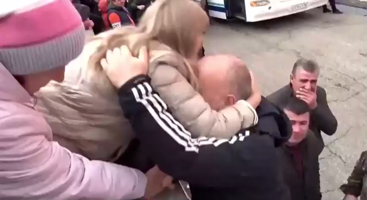Still in the Russian Far East, in the city of Neryungri, a community video channel posted video of families saying goodbye to a large group of men, as they board buses. The video shows a woman crying and hugging her husband goodbye, while he reaches for his daughter’s hand from the bus window.