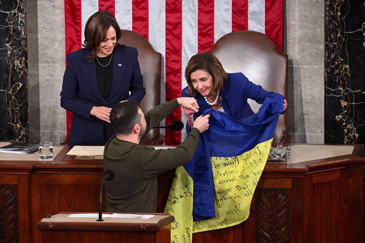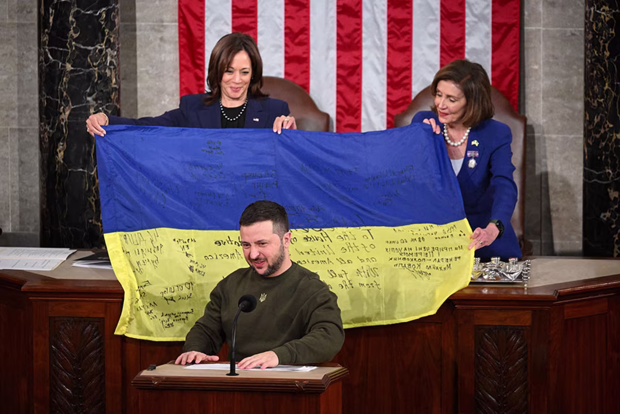 Ukraine's President Volodymyr Zelensky addresses a joint meeting of Congress as Vice President Kamala Harris, left, and House Speaker Nancy Pelosi (D-CA) hold a Ukrainian national flag at the US Capitol in Washington, D.C. on Wednesday, December 21, 2022. -