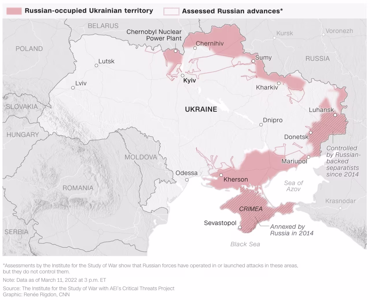 A large swath of Makariv, a village 30 miles west of Kyiv, has sustained significant damage from apparent Russian airstrikes.