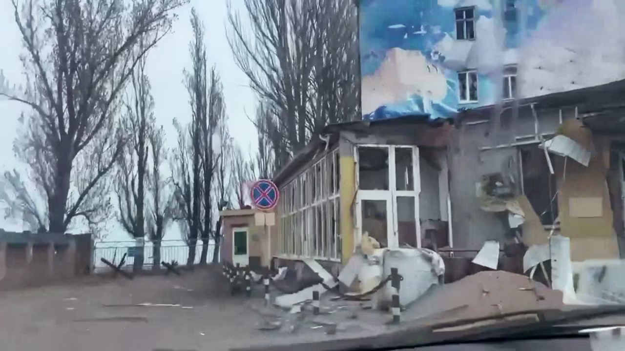 In the video, the shipyard’s entrance sign and gate can be seen. Debris is scattered outside the gate, where a car and a forklift appear to have been strategically placed to block access.
