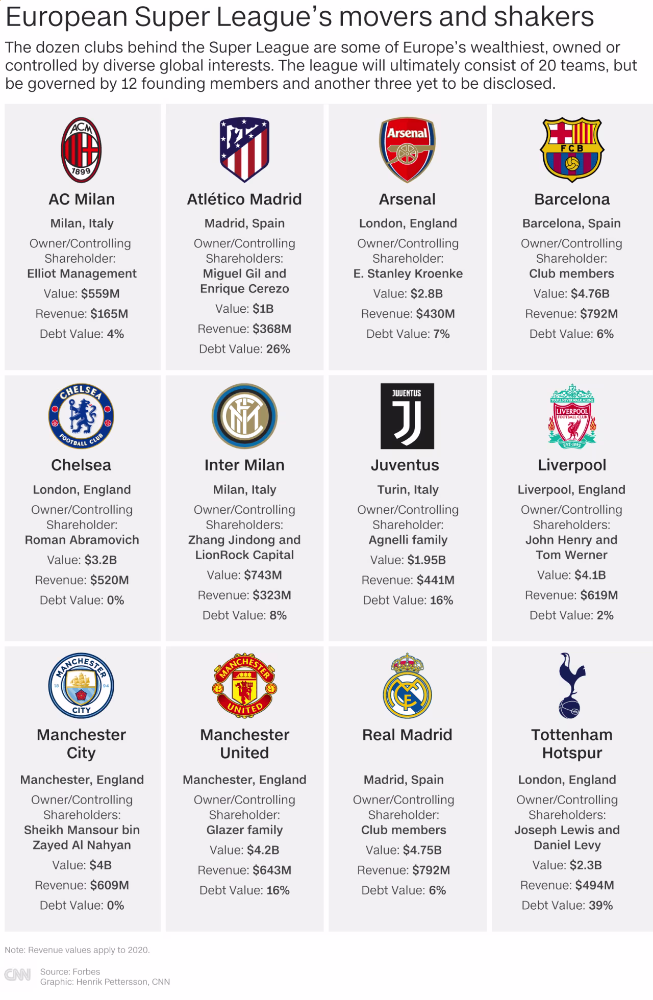 Who’s behind the plans? Six English clubs – Arsenal, Chelsea Liverpool, Manchester City, Manchester United, and Tottenham Hotspur – alongside three teams from Italy – AC Milan, Inter Milan and Juventus – and three from Spain – Atlético Madrid, Barcelona and Real Madrid – are behind the plans.
