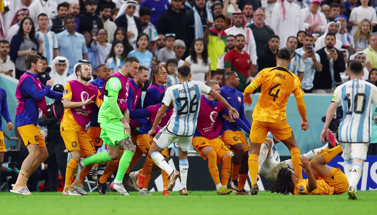 After committing a foul on a slide tackle, Argentina’s Leandro Paredes kicked the ball off the pitch and into the area of the Netherlands’ bench, quickly bringing the Dutch players out to meet him.