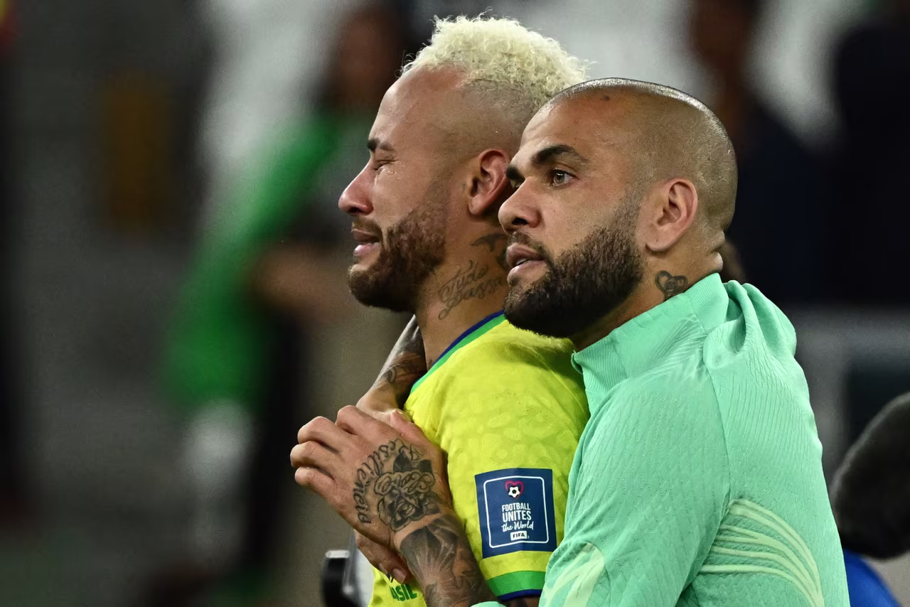 Brazil’s Neymar, left, is comforted by teammate Dani Alves after being eliminated from the World Cup.