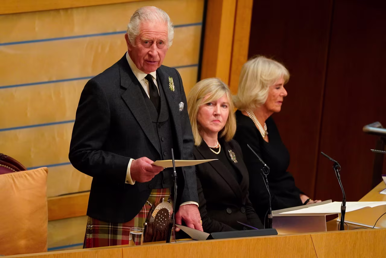 - The King earlier made his first address to the UK’s Parliament, where he referenced Shakespeare, saying that the Queen was “a pattern to all princes living.”