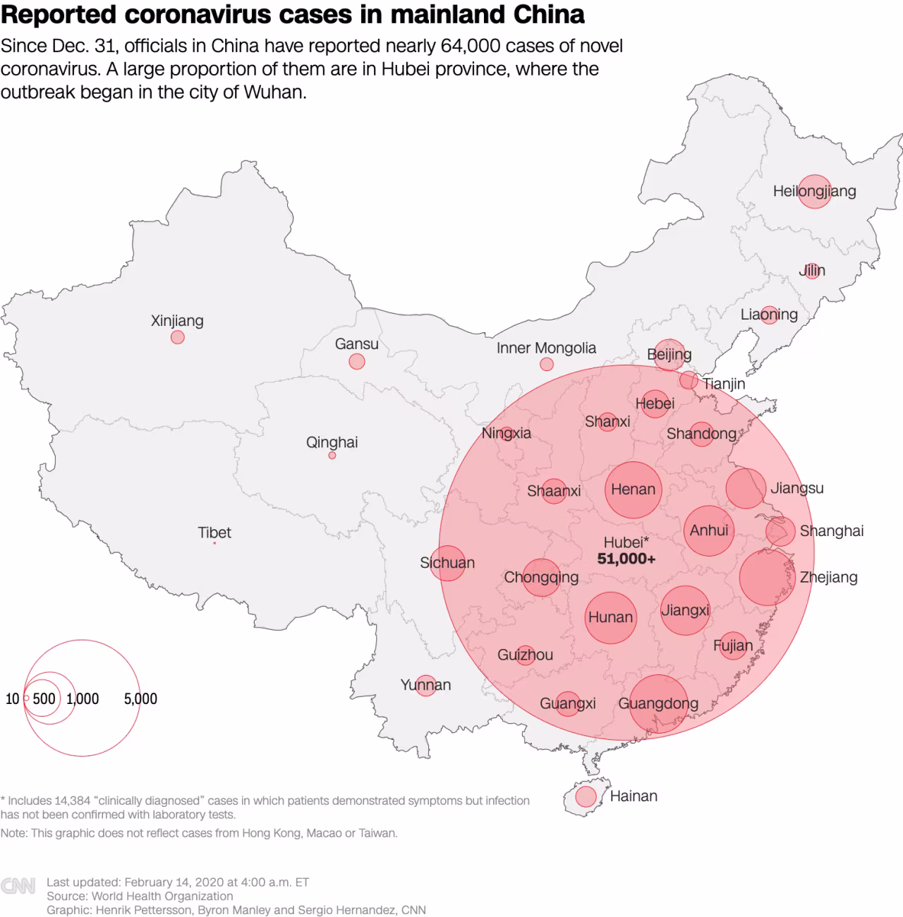 Nearly 64,000 cases of novel coronavirus have been reported in mainland China since Dec. 31.