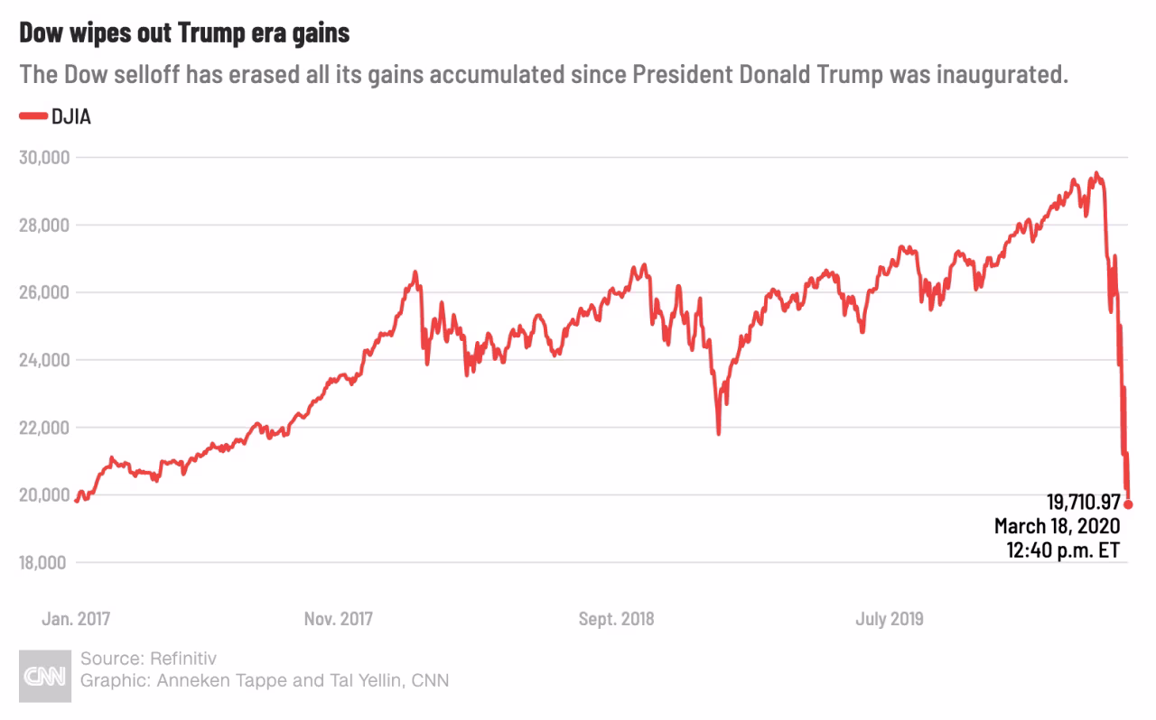 The Dow closed below 20,000 total points for the first time since February 2017. It was down 6.3%, or 1,338 points, on the day. During the afternoon, the index fell so much that it erased all of the gains accumulated under the Trump administration – though it closed slightly above that key level.