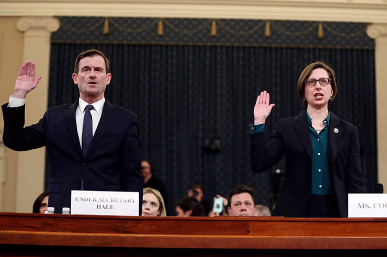 The two witnesses, Pentagon official Laura Cooper and David Hale, the undersecretary of state for political affairs, have been sworn in. They are now delivering their opening statements.