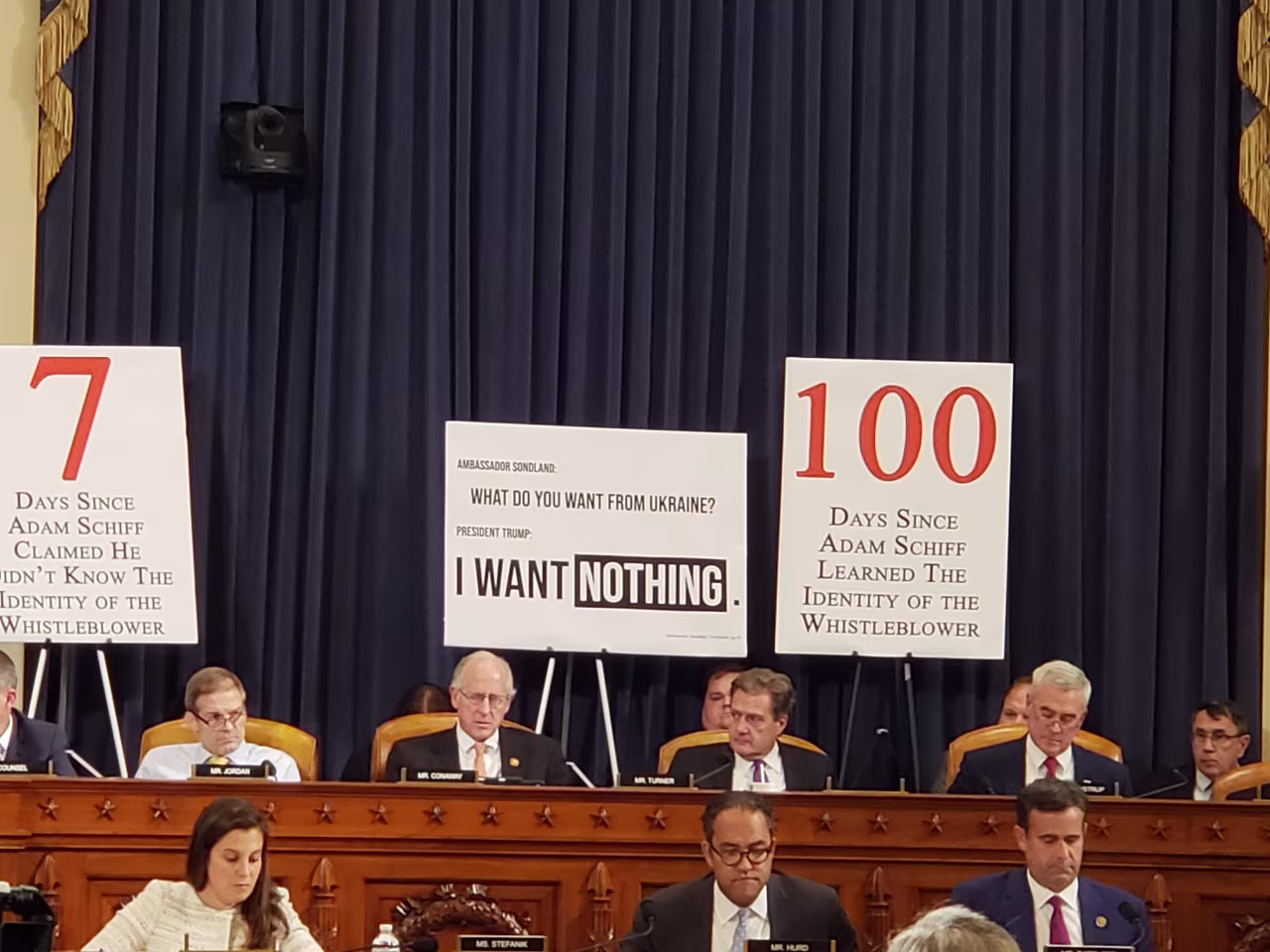 That’s the same quote that Trump read to reporters earlier today, from Sondland’s Sept. 9 call. Republicans have used displayed quotes for each day’s hearings.