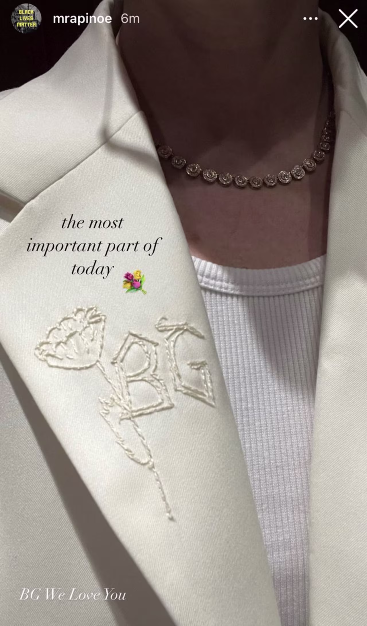 Megan Rapinoe’s blazer lapel has an embroidered flower and the initials “BG” — a nod to Brittney Griner who is currently being detained in Russia.