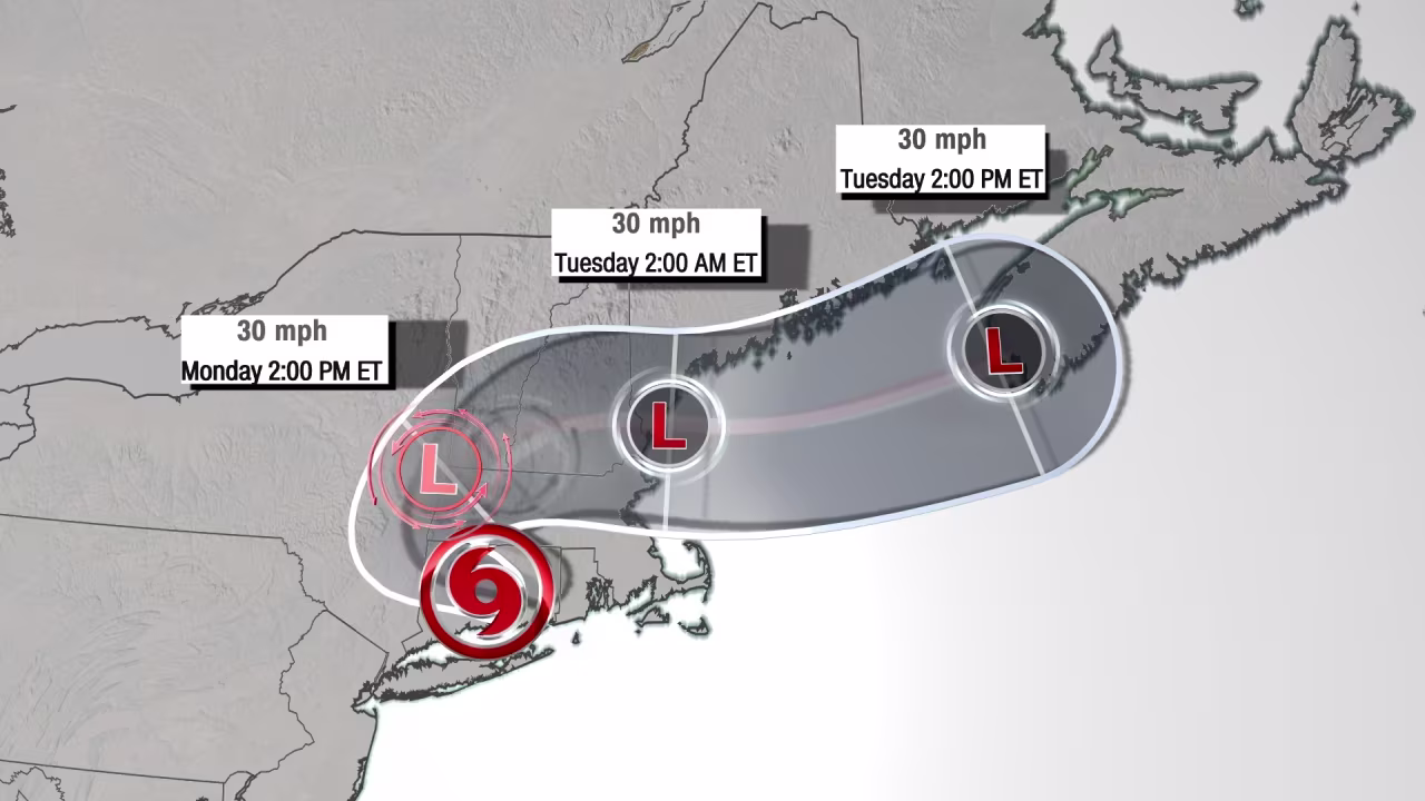 The center of the storm will track toward the Connecticut/New York border tonight, then take a turn to the east and eventually travel out to sea beginning Monday afternoon.