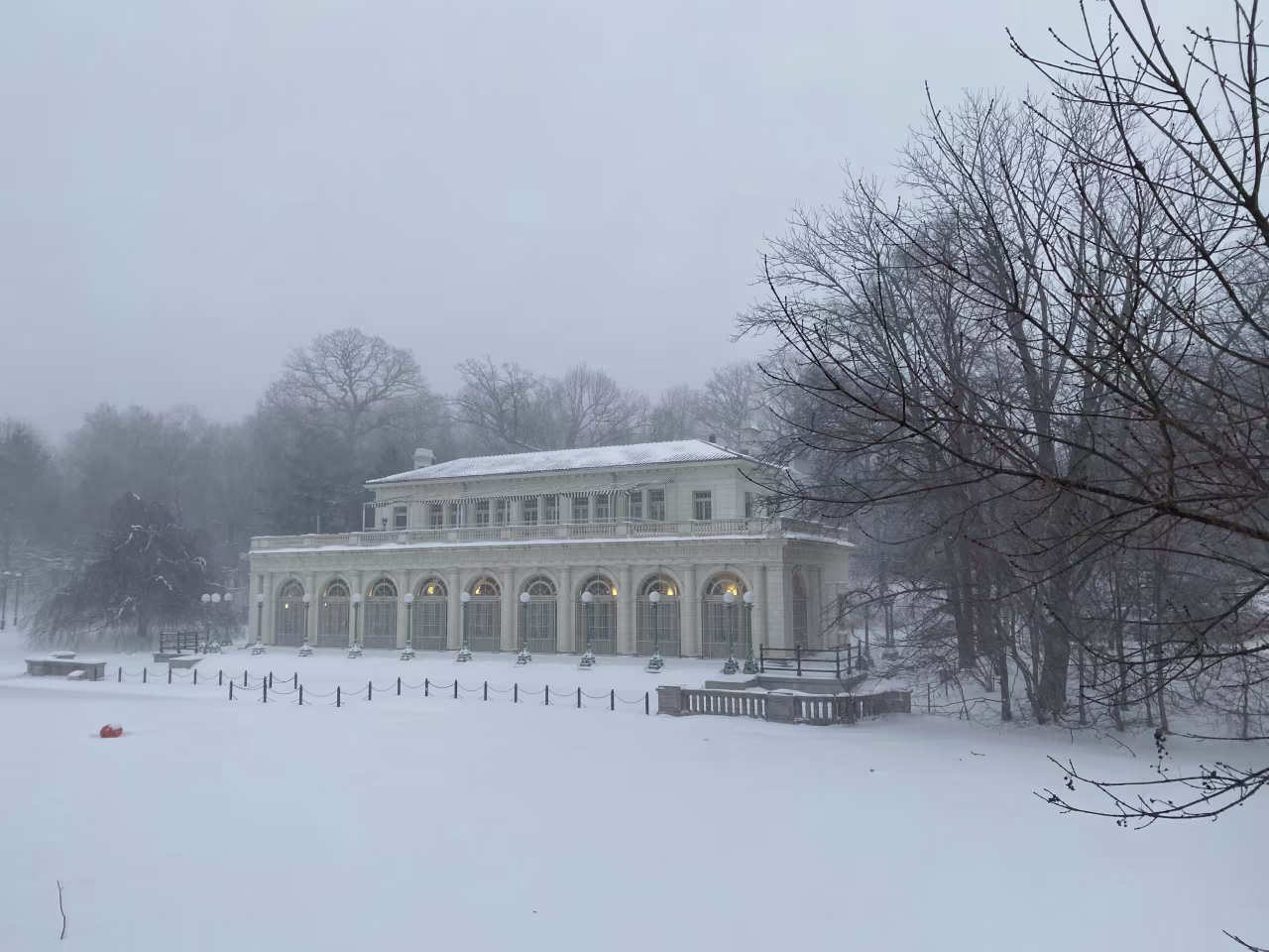 The inn is right on the water, but the ocean can barely be seen right now because of the blowing snow.